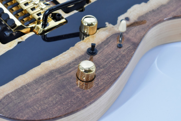 ※ボディ・トップの杢目、レジンの入り方、及び指板の杢目は1本1本異なります。本製品の製作全量すべてに1か所以上の太筋レジン及びサップ(白太)部があります。