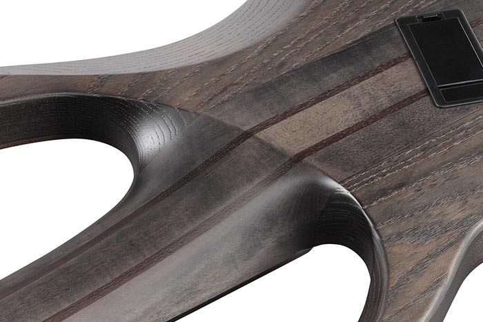 ネックをサンドする両翼のウイング・ボディは、抜けが良くクリアなサウンド特性のアッシュ材と中低音域特性に富むオコウメ材、さらに個性的なバール杢入のポプラ材をTOPへ貼り合わせた積層構造です。