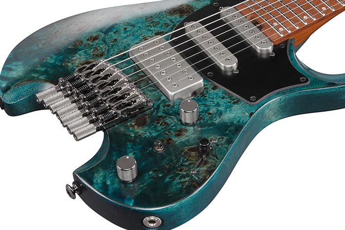 “Q”7弦用のために設計されたシングルコイル・ピックアップ「R1-7」とハムバッカー・ピックアップ「Q58-7」を組み合わせて、S-S-H配列で搭載しています。どちらも、エフェクター等でサウンドメイクしやすいよう、全帯域がバランスよく聴こえるように設計されています。低域は濁らずパワフルで、高域は明るくクリアでありながらも、耳障りの良いサウンドを特長としています。