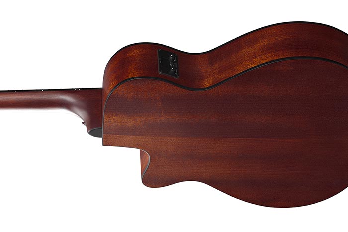 The Okoume back and sides generate a woody, warm tone when the guitar is played softly or finger-picked and provide punchy high-mids with a clear projection when strummed.
